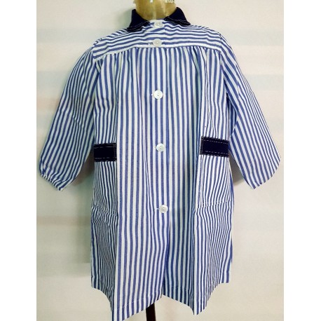 Bata de rayas , con cuello camisero, dos bolsillos frontales .